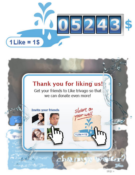 Milano, 04 Ottobre 2011. Un dollaro per ogni nuovo like sulla fan page di Facebook. Questo é quanto trivago donerá fino al 31 ottobre all’associazione Charity: Water. Alla fine del mese la somma complessiva verrà devoluta in favore dell’ organizzazione no-profit che porta acqua pulita e sicura nei paesi in via di sviluppo, utilizzando il 100% dei contributi dei sostenitori per i suoi progetti di beneficenza.