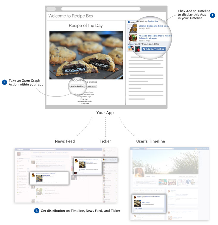 Il nuovo Facebook Open Graph consente agli sviluppatori di applicazioni di terze parti di esplorare a fondo il social graph di Facebook in modo da consentire la condivisione sulla timeline di un gran numero di nuovi verbi: non più soltanto mi piace o ha pubblicato, ma anche ha cucinato, ha corso, ha letto, ha visto, ha comprato, ecc. Perché ogni volta che un utente leggerà un articolo su un giornale online, ascolterà una canzone, o avrà visto un film, questa attività verrà pubblicata sulla sua Timeline e condivisa con gli amici.