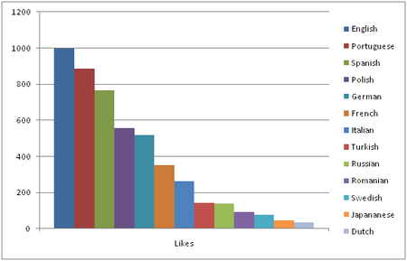 Passiamo ora ai numeri. Il primo grafico mostra i dati grezzi: il numero di mi piace per lingua. Come possiamo vedere, lo spagnolo, il portoghese e l´inglese hanno più di 700 mi piace: queste sono, infatti, le comunità linguistiche più numerose. Dall´altro lato ci sono il giapponese e il nederlandese con meno di 50 mi piace. Queste cifre, sebbene necessarie, hanno un´importanza limitata, dato che non prendono in considerazione la percentuale di utenti di Facebook in ciascuna comunità linguistica.