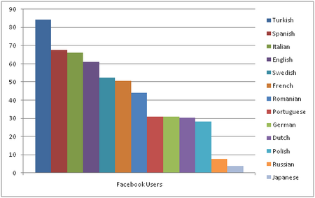 Tra i risultati più interessanti va notato che gli utenti di Internet di lingua turca sono particolarmente devoti a Facebook: quasi l´80% ha un account. Utilizzano Facebook quasi i 2/3 degli utenti di lingua spagnola, italiana e inglese. Tra i mercati più deboli troviamo la Russia e il Giappone, con rispettivamente soltanto l´8% e il 4% circa di utenti registrati su Facebook. Il social media più usato in Giappone è Mixi, mentre molto usato in Russia è VK, ed è questo il motivo alla base del minor numero di mi piace in queste lingue.