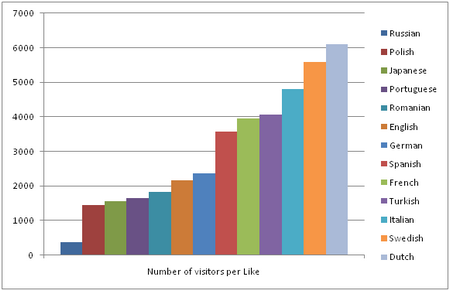 Questi sono i primi risultati esclusivi che possiamo analizzare in questo studio. Se è vero che prima abbiamo stabilito che la percentuale di utenti iscritti a Facebook che parlano il russo è molto bassa se confrontata con quella dei parlanti di altre lingue, questa piccola percentuale di utenti è molto attiva e disposta a cliccare sul pulsante mi piace: i nostri dizionari piacciono a un visitatore su 337.