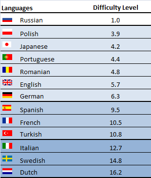Data la specificità del servizio da noi offerto, abbiamo operato una piccola “ristrutturazione” dei dati. In questo modo è più facile interpretare i risultati per tutti i tipi di attività, non solo la nostra. Prendendo il russo come modello in base al quale stabilire la difficoltà di ottenere un mi piace, si avranno i seguenti risultati: