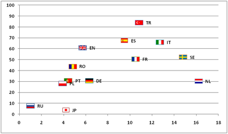 Nella tabella sottostante, è possibile vedere il rapporto che c´è tra il numero di utenti di Facebook (in percentuale rispetto al numero di utenti di Internet) e il livello di difficoltà. Se si escludono Russia, Giappone e Brasile, per i quali non è possibile individuare alcun comportamento ricorrente, e la deviazione estrema dei paesi di lingua nederlandese e turca, è possibile notare che il livello di difficoltà è proporzionale al numero di utenti di Facebook in un paese. Il che conferma (almeno in parte) quanto affermato al punto 2. La spiegazione più plausibile risulta essere la prima. Quindi, in conclusione è possibile affermare che l´approccio al “mi piace” cambia a seconda della lingua e del paese.